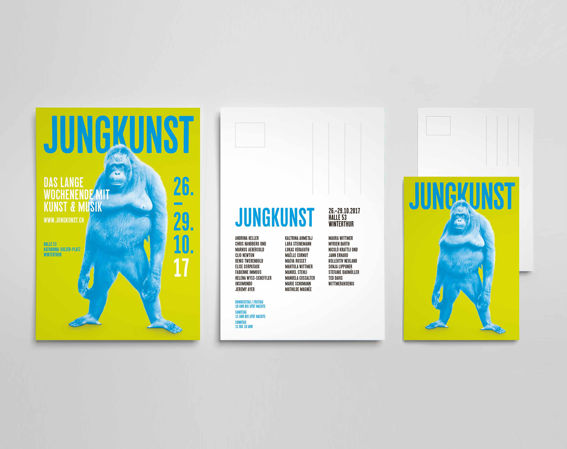 I’ve started helping out at the Jungkunst exhibit in 2013 as a regular volunteer. Over the years, I’ve worked myself up and had become a member of the board. I took over the position of the creative lead and art direction of the association. I was in charge of all visual, corporate and marketing materials related to the art exhibition. I was responsible for the annual advertising campaign, online presence of the event, social media content, editorial design and print materials such as the art catalogue, flyers, poster etc. I was also tasked to create various merchandising products for example volunteer-shirts, beer mats … As part of the organising and creative committee I was also responsible for the exhibitions signalisation, interior and mural design. During the event itself, I helped with the communication and coordination of the more than 200 volunteers. Strichpunkt the design agency I was working for is a big sponsor of Jungkunst. Therefore, I was able to design most of the marketing materials whilst working for the agency.